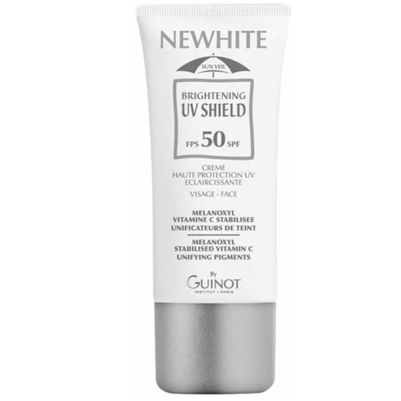 Guinot Crème Newhite UV 50 mit sehr hohem Lichtschutzfaktor (SPF50), wirkt gezielt sonnenbedingter Hautalterung entgegen und schenkt ein ebenmäßiges Hautbild. Das enthaltende Melanoxyl verlangsamt die durch UV-Strahlen bedingte Melaninbildung. Es bewirkt gleichzeitig die Reduktion des bereits bestehenden Melanins. Zudem schützt es die Haut vor freien Radikalen und stimuliert den Kollagenaufbau. Dank der effektiven Wirkung gegen freie Radikale bekämpft Guinot Crème Newhite UV 50 oxidativen Stress, der zu einer vorzeitigen Hautalterung beitragen kann. Bei regelmäßiger Anwendung erscheint die Haut deutlich heller, ebenmäßiger und kommt durch eine leuchtende Ausstrahlung zur Geltung. Die Entstehung von Pigmentflecken wird vorgebeugt und die oberen Hautschichten werden unmittelbar mit Feuchtigkeit versorgt.Guinot Crème Newhite UV 50 - Aufhellende Gesichtscreme mit Lichtschutzfaktor 50 für einen ebenmäßigen Teint.Guinot Crème Newhite UV 50 mit Lichtschutzfaktor 50, lässt den Teint durch aufhellendes Melanoxyl und Vitamin C ebenmäßig erscheinen und schützt die Haut vor Auswirkungen schädlicher UV-Strahlen.Was kann Guinot Crème Newhite UV 50?- Hellt die Haut und Hyperpigmentierungen auf- Schützt vor UV-Strahlen und vor Sonnenbränden- Absorbiert UVA- und UVB-Strahlen und reduziert schädliche Auswirkungen- Verhindert die Bildung von Pigmentflecken- Stimuliert die Kollagensynthese- Bekämpft oxidativen Stress und schützt vor schädlichen Umwelteinflüssen- Bekämpft negative Einflüsse durch freie Radikale und verlangsamt so eine vorzeitige Alterung der Haut- Lässt den Teint sofort gleichmäßiger erscheinen- Verleiht Frische und entfernt einen Grauschleier der Haut- Hebt die AusstrahlungskraftHocheffektive Wirkstoffe in Guinot Crème Newhite UV 50- Sonnenfilter: schützen die Haut vor UVA- und UVB-Strahlen- Melanoxyl: bremst die durch UV-Strahlen ausgelöste Melaninproduktion und verringert die anfängliche