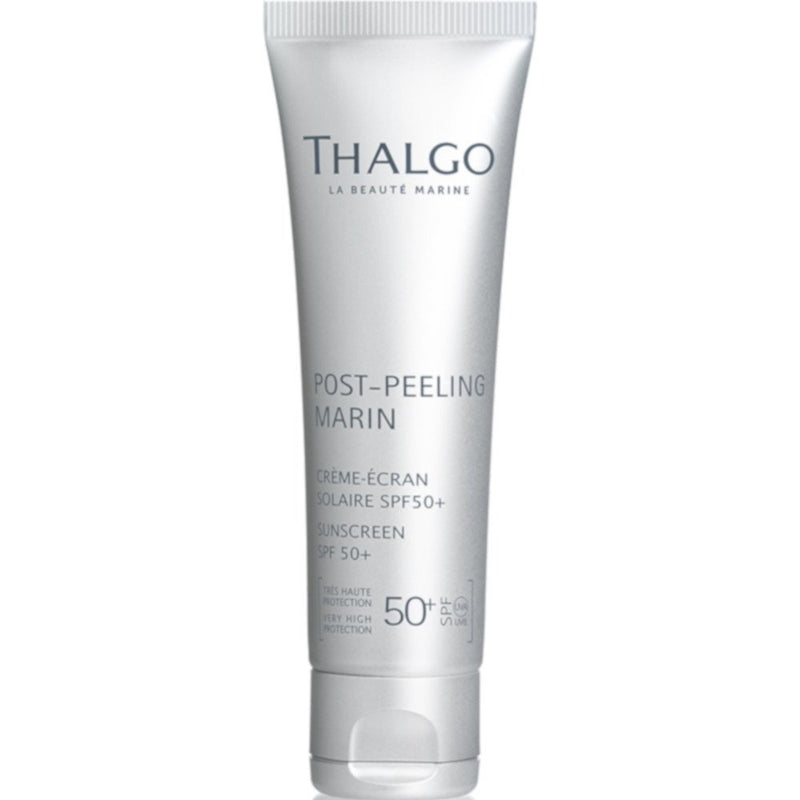 Thalgo Post-Peeling Marin Creme Ecran Solaire SPF50+ morgens nach der Pflegecreme auf das Gesicht und den Hals auftragen. Nach der Verwendung eines Peelings empfohlen.